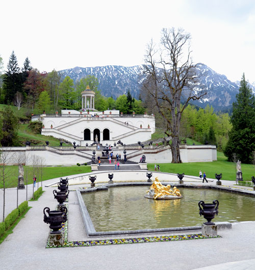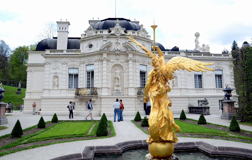 ปราสาท Linderhof (อ่านว่า ลินเดอโฮฟ) ตั้งอยู่ชานเมือง Ettal (อ่านว่า เอ็ดเทาว์) ของเจอมันนี ซึ่งอยู่ใกล้ชายแดนประเทศ Austria หากเดินทางจากเมือง Füssen ต้องขับรถเข้าประเทศ Austria ที่เมือง Reutte (อ่านว่า รูทเท) แล้วจึงวิ่งลัดเลาะข้างทะเลสาบ Plansee ชมวิวของทะลสาบแห่งนี้ แล้วจึงวิ่งผ่านชายแดน Austria เข้าสู่เจอมันนีอีกครั้ง ใช้เวลาเดินทางทั้งหมดประมาณ 1 ชั่วโมง ปราสาทแห่งนี้สวยงามไม่แพ้ปราสาท Neuschwanstein เนื่องจากเป็นปราสาทที่กษัตริย์ Ludwig ที่ 2 เสด็จประทับอาศัยเมื่อยังมีพระชนชีพอยู่ พวกเราแสดงตั๋ว “14-days-tickets of the Bavarian Palace Department” ที่ Ticket Office เพื่อรับตั๋วสำหรับเข้าชมภายในตัวปราสาท พื้นที่โดยรอบบริเวณปราสาท Linderhof นั้นกว้างใหญ่มาก ถูกจัดเป็นสวนธรรมชาติ สามารถเดินเล่นได้ฟรี โดยไม่ต้องซื้อตั๋ว ตั๋วที่เราได้มานั้นใช้เฉพาะเข้าชมภายในปราสาทเท่านั้น หลังจากเราชมภายในปราสาทเสร็จแล้ว เราเดินเล่นดูสวนรอบปราสาท แวะซื้อของที่ระลึกตามร้านค้า และเดินทางกันต่อไปยังเมือง Oberammergau