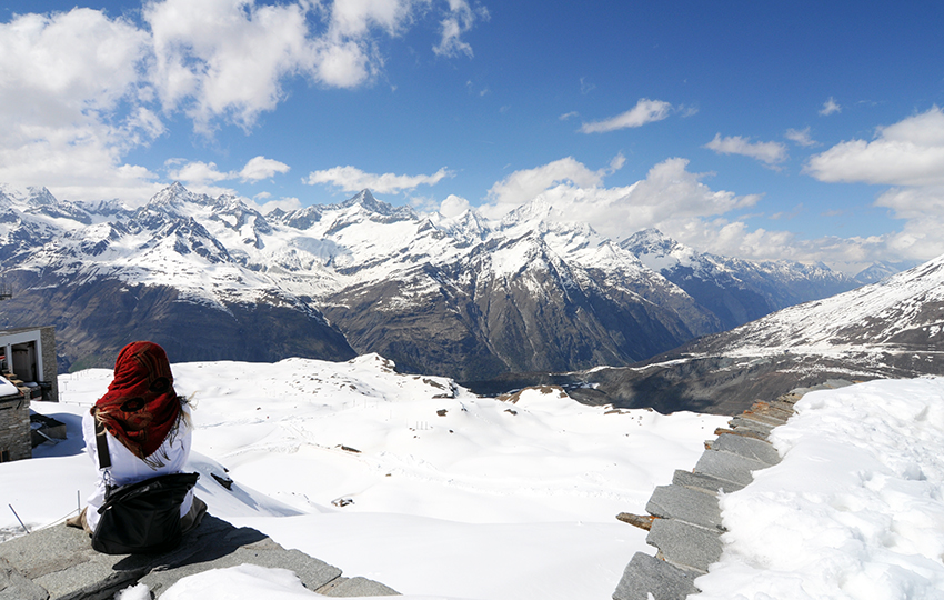 เส้นทางรถไฟ Zermatt – Gornergrat เป็นเส้นทางขึ้นภูเขาสูง ใช้เวลาทั้งหมดประมาณ 40 นาที โดยรถไฟแวะจอดสถานีกลางทาง 4-5 สถานี สำหรับให้นักท่องเที่ยวลงเล่นสกีกัน หลังจากรถไฟออกจาก Zermatt ระหว่างทางผมเห็นเมือง Furi มีกระเช้าขึ้นเขาอีกลูกหนึ่ง เสียดายว่าพวกเรามาพักที่นีแค่วันเดียว เอาไว้ถ้าได้มา Zermatt อีกต้องเดินไปเหยียบเมือง Furi แน่นอน กลับมาที่เส้นทางรถไฟกันต่อ หลังจากรถไฟจอด 2-3 สถานี วิวสองข้างทางก็เต็มไปด้วยหิมะ ขาวโพลนไปหมดครับ เราโชคดีที่วันนี้ท้องฟ้ามีเมฆไม่มาก ถือว่าฟ้าใสพอสมควรครับ รถไฟวิ่งไม่นานก็ถึงสถานีสุดท้าย Gornergrat บรรยากาศข้างบนนี้มีชีวิตชีวาจริงๆ ครับ ทุกคนยิ้มแย้มแจ่มใส ดีใจที่ได้พิชิตยอดเขาสูง 3089 เมตร พร้อมกับถ่ายรูปกับป้ายเป็นที่ระลึกกัน ช่วงเวลานั้นมีก้อนเมฆหนาบดบังยอดเขา Matterhorn อยู่ เราจึงไม่ได้เห็นยอดเขาชื่อดังนี้มากนัก แต่บริเวณนั้นก็มียอดเขาอื่นที่สูงกว่า Matterhorn อยู่หลายยอด เพียงแต่รูปร่างของยอดเขาไม่สวยเหมือนกับยอดเขา Matterhorn พวกเราเดินขึ้นไปที่จุดสูงสุดของ Gornergrat สนุกกับการชมวิว 360 องศาและถ่ายรูปเล่นกับหิมะอยู่เป็นชั่วโมงครับ โชคดีที่ใส่เสื้อผ้ามาเต็มสตีมครับ เลยไม่ค่อยรู้สึกหนาวเท่าไหร่ ยกเว้นหัว พอดีผมลืมหมวกไหมพรมใว้ในรถ ตอนขับรถไปจอดฝากไว้ที่โรงแรมลืมหยิบมาด้วย เลยต้องเอาผ้าพันคอสีขาวชมพูของพิงพันหัวกับหูไว้เหมือนคุณหญิงแต้วเลย