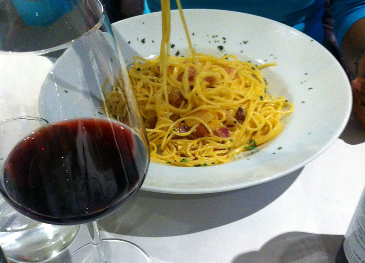 มื้อนี้เราสั่ง Pizza สปาเก็ตตี้ 4 จาน และสเต็กปลาจากทะเลสาบ Como กินกับไวน์แดงอิตาลียี่ห้อ Dame & Fuet ปี 2007 1 ขวดและน้ำแร่ 1 ขวด เพื่อต้อนรับการมาเยือนประเทศอิตาลี สปาเก็ตตี้กับพิซซ่ากินในอิตาลีร้านไหนยังไงก็อร่อยครับ เข้ากับไวน์ได้ดี มื้อนี้เราจ่ายไปทั้งหมด 103 Euro กินเสร็จจึงเดินกลับไปที่รถ ฟ้าเริ่มจะมืดทำให้ยิ่งดูเปลี่ยวเข้าไปใหญ่ครับ เดินตามข้างตึกแล้วรู้สึกไม่ค่อยปลอดภัยมากขึ้นครับ เมืองนี้ดูน่ากลัวจริงๆ ครับ เรารีบเดินกลับไปที่รถแล้วขับรถกลับโรงแรม จอดรถที่จอดรถของโรงแรมทางด้านหลัง แล้วเข้าห้องพักครับ วันนี้เรายังนอนไม่ได้ครับ เพราะว่าเราต้องขึ้นเครื่องกลับคืนวันพรุ่งนี้ วันนี้เราจึงต้องจัดกระเป๋าเดินทาง ยัดของที่ซื้อๆ กันมาทั้งหมดใส่กระเป๋าของตัวเอง แล้วจึงอาบน้ำ นอนครับ