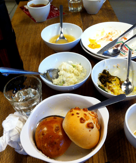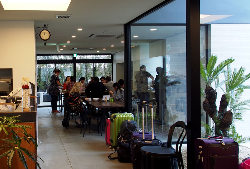 อาจจะเป็นเพราะว่า ที่นี่มีพื้นที่ค่อนข้างจำกัด สัดส่วนห้องครัวเล็กกระทัดรัด แขกเข้าพักเยอะและตื่นเช้ากัน ทำให้ห้องครัวเต็ม ไม่มีที่นั่งว่างเลย พวกเราจึงมานั่งทานอาหารเช้ากันใน Lobby อาหารเช้าที่นี่มีหลากหลายพอสมควร มีขนมปังก้อนหลายรส ครัวซองค์ ขนมปังปิ้ง Cheese มาการีน แยมรสต่างๆ สลัด ข้าวผัด ข้าวปั้น ผักดอง 3-4 อย่าง ซุปมิโซะหลายรสให้เลือก ชา กาแฟ น้ำเปล่า ที่นี่จะไม่มีพวกเนื้อ ไข่ Ham หรือไส้กรอก เพื่อลด Cost ลงมา ถือได้ว่าราคาที่พักรวมอาหารเช้า คนละ 3,300 เยน ไม่แพงเลยทีเดียว อาหารเช้าที่นี่ก็ Self service เหมือนทั่วๆ ไป หยิบ ตักเอง หิ้วเอง ยกเอง มีไม่เหมือนที่อื่น คือ ต้องล้างจานเอง!