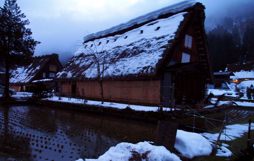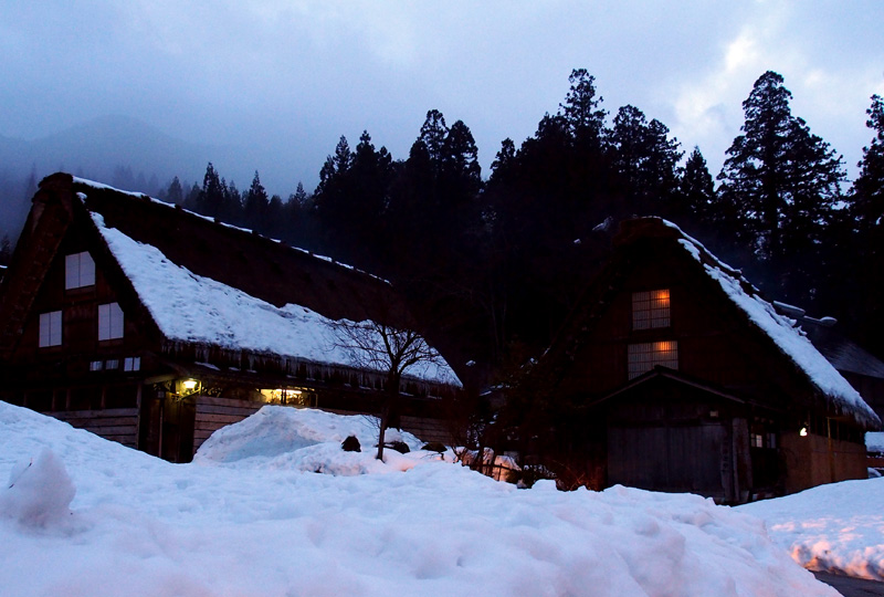 พวกเรานั่งพักดื่มน้ำชาให้คลายหนาวและสัมผัสบรรยากาศบ้านชาวนาญี่ปุ่นภายในห้องพัก แล้วจึงออกไปเดินเล่นก่อนฟ้าจะมืดลง ทางบ้านพักมีรองเท้ายางใส่ลุยหิมะไว้บริการให้กับแขก โดยเจ้าของบ้านนัดพวกเราทานอาหารเย็นในเวลา 1 ทุ่มตรง เราเดินเล่นถ่ายรูปบรรยากาศของที่นี่ใกล้ๆ กับบ้านพัก น่าเสียดายที่เราเดินทางมาถึง Shirakawago ช้าเกินไปจึงมีเวลาเดินเล่นไม่นาน ฟ้าก็มืดซะก่อน บนถนนสายรองรอบๆ บ้านพักไม่มีไฟถนน จึงมืดไปหมดทำให้เดินลำบาก พวกเราจึงกลับเข้าที่พักเพื่อเตรียมตัวทานอาหารมื้อเย็นทีเจ้าของบ้านจัดเตรียมไว้ให้