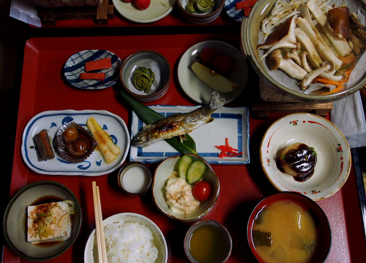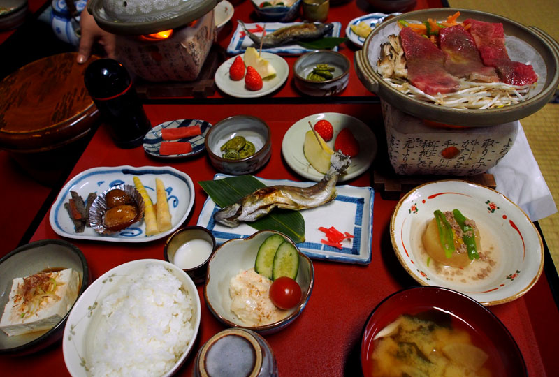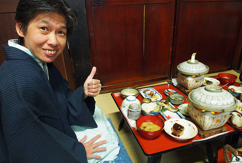 หลังจากที่เจ้าของบ้านตระเตรียมอาหารเย็นพร้อมและได้เวลานัด 1 ทุ่มตรง เธอจะเดินมาเรียกเชื้อเชิญแขกที่หน้าห้องพักทุกห้องให้ออกมารับประทานอาหารกันในห้องทานอาหารภายในบ้าน อาหารถูกวางไว้อย่างเป็นระเบียบเป็นชุดๆ พวกเราใส่ชุดยูกะตะเข้าไปทานอาหารญี่ปุ่นจัดเต็มมื้อเย็นกัน ถึงแม้อาหารมื้อเย็นดูปริมาณไม่มากเท่าอาหารไทย แต่รสชาติอาหารนั้นอูมาหมิ อร่อยถูกปากคนไทย อาหารหลักของที่นี คือ เนื้อวัว หรือเห็ด (สำหรับคนไม่ทานเนื้อ) ปลาแม่น้ำย่าง เต้าหู้ สลัดถ้วยเล็ก ซุปมิโซะ ผักดองรสต่างๆ ข้าวสวย ผลไม้และชาเขียวร้อน พวกเรากินกันจนอิ่มกันทุกคน