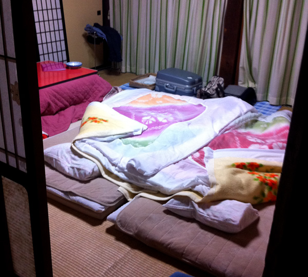 ระหว่างที่เรารับประทานอาหารมื้อเย็นอยู่นั้น เจ้าของบ้านจะเข้าไปที่ห้องพักของแขกเพื่อปูที่นอนให้กับพวกเรา หลังจากที่เราทานอาหารเสร็จกลับเข้าไปในห้อง ห้องนั่งเล่นก็จะถูกเปลี่ยนเป็นห้องนอน พวกเรานั่งเล่นคุยพักผ่อนภายในห้อง ข้างนอกค่อนข้างมืด ฝนตกปรอยๆ ถึงแม้จะอากาศหนาวเย็นและเต็มไปด้วยหิมะ แต่ heater ตัวเล็กทำให้อุณหภูมิภายในห้องอุ่นได้เป็นอย่างดี บ้านพัก Kidoya หลังนี้มีกฏว่า ห้องอาบน้ำปิดเวลา 4 ทุ่มตรง เจ้าของบ้านซึ่งพักอาศัยอยู่บ้านเหมือนกันจะได้มีเวลาพักผ่อนแล้วตื่นเช้าเพื่อให้บริการเตรียมอาหารต่อไป พวกเราจัดของแล้วทยอยกันไปอาบน้ำ แล้วรีบเข้านอนจะได้มีเวลาเดินเที่ยวในหมู่บ้านแห่งนี้ได้อย่างเต็มอิ่มในเช้าวันรุ่งขึ้น