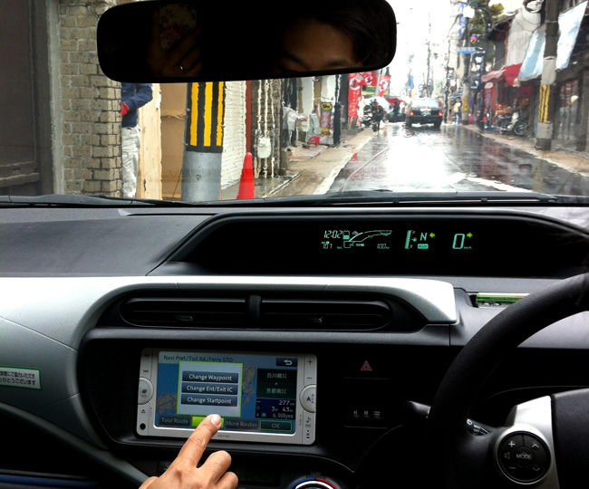 ผมขับรถออกมาเพื่อวนไปรับคนอื่นๆ ที่ Piece Hostel Kyoto ซึ่งอยู่ในซอยเล็กๆ จอดรถที่ด้านหน้าและรีบขนกระเป๋าสัมภาระขึ้นรถ (ที่นี่ไม่มีที่จอดรถ) พวกเราต้องการแวะไปถ่ายรูปเสาแดงๆ ที่ศาลเจ้าฟูซิมิ อินาริกันก่อน ผมไม่แน่ใจเหมือนกันว่า บริเวณนั้นมีที่จอดรถหรือเปล่า ผมได้สอบถามกับ Reception ของ Hostel แต่เธอตอบว่า ไม่มี ผมเปลี่ยนให้อ้อมขับรถ โดยผมขอเรียนรู้ทำความเข้าใจกับ GPS(ภาษาอังกฤษเฉพาะหน้าเมนูหลักเพียงหน้าเดียว นอกนั้นเป็นภาษาญี่ปุ่นหมด) ตอนแรกๆ ผมยังใช้มันไม่ค่อยเป็น จึงทำให้หลงทางบ้าง ขับวนตาม GPS บ้าง การขับรถในญี่ปุ่นนี้เราจำเป็นต้องพึ่ง GPS มากที่สุด การขับไปตามหนังสือแผนที่หรือใช้ GPS ไม่เป็น ทำให้หลงได้ง่ายๆ เพราะในญี่ปุ่นถนน ซอกซอยต่างๆ เล็กและแคบ ในเมืองจะสลับซับซ้อนพอสมควร