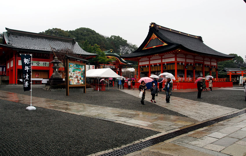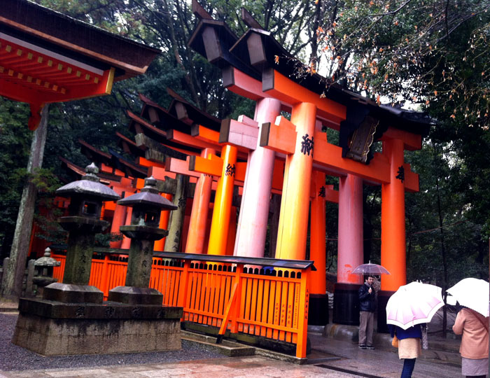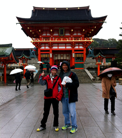 สักพักเราก็ขับมาถึงศาลเจ้าฟูซิมิอินาริ ตอนแรกไม่แน่ใจว่าจะจอดรถที่ไหนกันดี พอดีเราขับรถไปด้านหน้าศาลเจ้า มีเจ้าหน้าที่โบกรถให้ไปจอดในที่จอดรถ บริเวณที่จอดรถนี้กว้างพอสมควร จอดรถได้เกือบ 100 คับ ที่จอดรถว่างเยอะครับ จอดฟรี! ด้วย ผมคิดว่า คนญี่ปุ่นส่วนใหญ่ไม่รู้เพราะไม่ค่อยขับรถกัน มักจะใช้บริการรถไฟเป็นหลัก ศาลเจ้าฟูซิมิ อินาริ ก็อยู่ติดกับสถานีรถไฟเลย การเดินทางมาที่นี่โดยรถไฟก็สะดวกดีครับ เราจอดรถแล้วแวะเข้าไปกราบไหว้ศาล ฝนยังตกปรอยๆ มาตั้งแต่เช้า ทำให้พวกเราต้องเสียตังค์ซื้อร่มกันฝน แล้วเดินเข้าไปถ่ายรูปเสาแดงที่ตั้งเรียงไปตามทางเดินขึ้นเขากัน