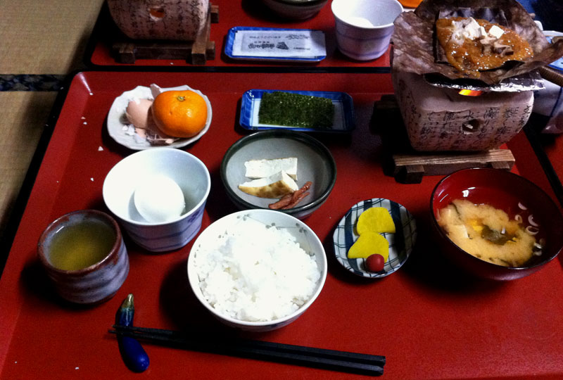 พวกเราตื่นกันเวลาประมาณ 6 โมงกว่า เมื่อคืนเป็นคืนแรกที่นอนหลับบนเสื่อทาทามิ ผมหลับสนิทเลย เมื่อคืนผมไม่ได้เปิด heater เพราะเป็นคนชอบอากาศหนาว ที่นอนกับผ้านวมหนาๆ ที่เจ้าของบ้านเตรียมไว้ให้นั้นอุ่นพอดี หลับสบายเลยครับ พวกเราทะยอยทำธุระส่วนตัวกัน ตอนเช้าห้องอาบน้ำที่นี่ไม่เปิดนะครับ สงสัยว่า เป็นธรรมเนียมที่นี่ละมั้งที่อาบน้ำวันละครั้งเฉพาะตอนค่ำ แขกที่มาพักจึงต้องทำตามธรรมเนียมปฏิบัติด้วย พวกเราได้แต่ล้างหน้า แปรงฟันกัน แล้วเก็บของเพื่อออกเดินทางกันต่อ รอเจ้าของบ้านเรียกทานอาหารเช้า