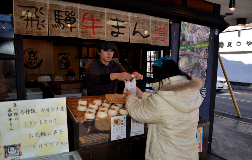 บ้านเรือนในเขตเมืองเก่า Takayama กับ Kyoto นั้นคล้ายๆ กัน แต่พวกเราไปถึง Takayama ช่วงเที่ยงกว่าๆ เห็นนักท่องเที่ยวเดินอยู่เยอะพอสมควร บรรยากาศดูคึกคักทีเดียว พวกเราเดินดูบ้านเรือนในเมืองนี้ไปเรื่อยๆ แวะชิมแป้งเสียบไม้ปิ้งราดน้ำจิ้ม ดูคล้ายๆ ลูกชิ้นย่างราดน้ำจิ้มบ้านเรา แต่ที่นี่เป็นแป้งปั้นเป็นลูกๆ แทน เรียกได้ว่า มันทำให้น้ำย่อยอาหารมื้อเที่ยงของเราทำงานทันที เราจึงไปหาอะไรหนักๆ ทานกัน ร้านอาหารที่นี่มีหลายร้านขายเนื้อวัว Hida Takayama สงนราคาเซ็ตนึงประมาณ 2,000 เยน ผมจึงเข้าลองสักหน่อยเดี๋ยวมาไม่ถึงเมืองนี้