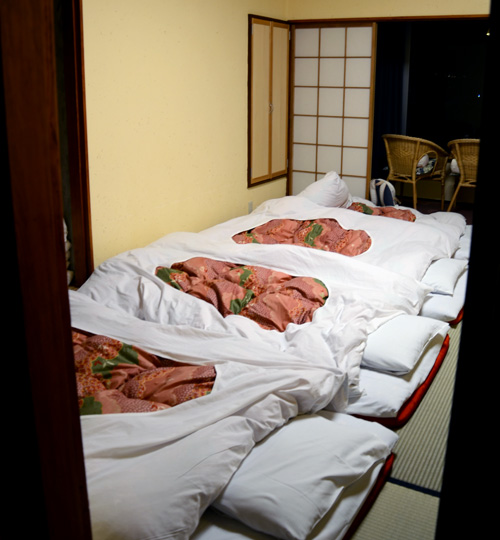 พวกเรากินกันเสร็จแล้วขับรถกลับโรงแรม อาบน้ำและนอนแช่ที่ห้อง Onsen ซึ่งอยู่บนชั้น 2 ชั้นเดียวกับห้องพักของเรา ในห้อง Onsen นี้สามารถนอนแช่น้ำเห็นวิวภูเขาไฟฟูจิได้เลย แต่เนื่องจากมืดแล้วจึงไม่เห็นภูเขาไฟ ไว้รอพรุ่งนี้เช้าค่อยมานอนแช่ Onsen อีกที จึงเดินกลับห้องพัก เข้านอนครับ พรุ่งนี้เจอกันนะ ฟูจิ