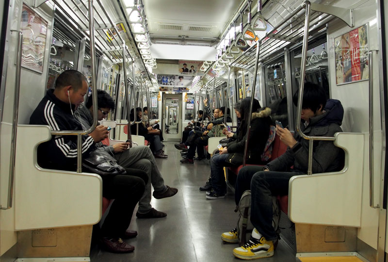 | รูปที่ 2 : คนญีปุ่นนั่งรถไฟไม่สนใจอะไรอ่ะ เอาแต่ดูหน้าจอของตัวเอง |