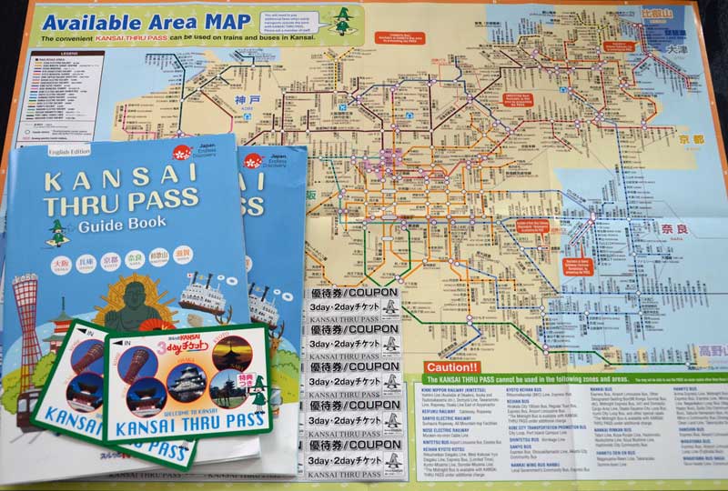 3. Kansai Thru Pass เป็นบัตรโดยสารสำหรับใช้นั่งรถไฟเอกชนหลายๆ บริษัท ทั้งรถไฟบนพื้นดินและรถไฟใต้ดิน เส้นทางที่ให้บริการครอบคลุมพื้นที่ทุกจังหวัดในเขตคันไซ และยังสามารถใช้ขึ้นรถเมล์บางสายในบางเมืองได้ด้วย มีตั๋วให้เลือก 2 แบบคือ ตั๋ว 2 วัน ราคา ราคา 4,000 เยน และตั๋ว 3 วัน ราคา 5,200 เยน ซึ่งสามารถซื้อกับบริษัทท่องเที่ยวในบ้านเราหรือซื้อที่สำนักงานในญี่ปุ่นเมื่อเดินทางไปถึงก็ได้ ทั้งนี้เราสามารถเลือกใช้ตั๋วในวันทีต้องการโดยไม่ต่อเนื่องกันได้ อายุของตั๋วจะนับเฉพาะวันที่ใช้งาน (ดูรายละเอียดเพิ่มเติมได้ที่ http://www.surutto.com/tickets/kansai_thru_english.html)
