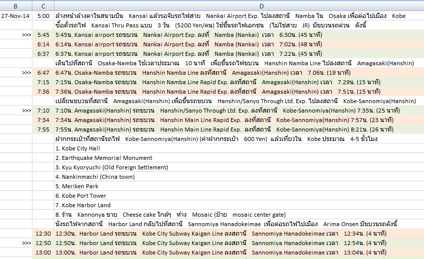 เช้าอาบน้ำในเล้าน์ของสนามบิน แล้วใช้ตั๋ว Kansai Thru Pass เป็นวันแรก ขึ้นรถไฟไปเมืองโกเบ ลงสถานี Kobe-Sannomiya(Hanshin) แล้วฝากกระเป๋าไว้ในสถานีรถไฟ แล้วไปเดินเล่นในเมืองโกเบ ช่วงบ่ายขึ้นรถไฟไปเมือง Arima Onsen แวะเดินเล่นและออนเซ็น แล้วขึ้นรถไฟกลับมาที่สถานี Kobe-Sannomiya(Hanshin) เพื่อเอากระเป๋าแล้วขึ้นรถไฟต่อไปยังเมือง Himeji ลงสถานี Sanyohimeji เดินลากกระเป๋าไปยังโรงแรมที่พัก Hotel Abest Himeji อยู่ใกล้ๆ สถานี จองห้องพักพร้อมอาหารเย็นและอาหารเช้าไว้ Check-in กินข้าวเย็นแล้วเดินเล่นแถวๆ ปราสาทฮิเมจิกับโรงแรม ค่าใช้จ่ายทั้งหมด มีดังนี้