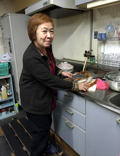 | รูปที่ 5 : เพื่อนของน้าปาน ชื่อน้าโม่ กำลังชำแหล่ะหมูกรอบที่พวกเราหอบหิ้วไป |
