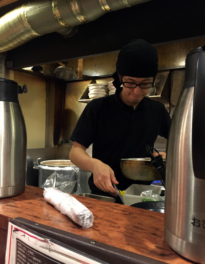| รูปที่ 7 : คนขายกำลังทำราเม็งให้พวกเรา มีหม้อน้ำชุปใบโตอยู่ข้างหลัง |