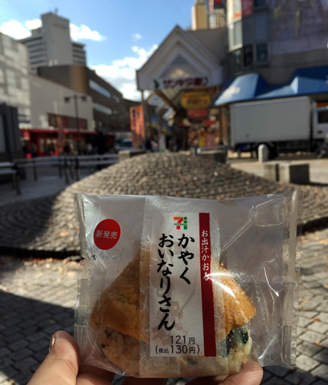 อย่างแรกที่ต้องทำคือ เดินหาอะไรกินให้อิ่มท้องก่อน อย่างอื่นค่อยว่าต่อไป กินเรื่องใหญ่ครับ ว่าแล้วก็ชวนพิงข้ามถนนไปหาอะไรกินบริเวณใกล้ๆ สถานีรถไฟ เดินหาอยู่สักพักไม่ค่อยเจอร้านอาหารเลย ร้านที่เปิดก็เป็นพวกร้านแฟรนชายน์ ไม่น่าสนใจเท่าไหร่ นี่คนญี่ปุ่นมันไม่ค่อยกินข้าวเช้ากันหรือไงเนี้ย สักพักเราก็เจอ 7/11 มีของกินขายเพียบ แถมมี Wifi ฟรีด้วย จึงซื้อของกินพวกแซนวิช ขนม น้ำผลไม้ ไปนั่งกินที่สวนเล็กๆ ที่อยู่ใกล้สถานีรถไฟกัน