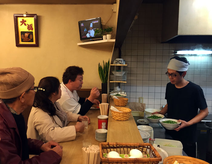 ป้านกลงรถไฟใกล้ๆ กับเมืองนะระเพื่อกลับบ้าน เมืองที่ป้านกอยู่มีภูเขาอยู่ล้อมรอบสงบเงียบเป็นธรรมชาติ หลีกหนีความวุ่นวายในเมืองใหญ่อย่างโอซะก้า ส่วนเราอีก 4 คนที่เหลือรวมทั้งพ่อใหญ่นั่งรถไฟไปลงที่สถานีเทนโนจิ (Tennoji) แล้วต่อรถไฟไปเมืองวะคะยะม่ะ (Wakayama) กันต่อ รวมทั้งหมดประมาณ 3 ชั่วโมง เราถึง Wakayama ประมาณ 5 ทุ่มกว่า น้าปานโทรนัดแนะกับเพื่อนว่าจะแวะไปหา ออกจากสถานีรถไฟพ่อใหญ่จึงเรียกแท็กซี่ไปที่ร้านเหล้าเล็กๆ ของเพื่อนน้าปานกัน พอลงจากรถแท็กซี่พ่อใหญ่เห็นพวกเราชอบกินราเม็ง เลยพากินราเม็งร้านคนรู้จักกันก่อน ถึงแม้ว่าเมือง Wakayama จะเป็นเมืองบ้านนอกแต่ร้านต่างๆ ก็จะเป็นร้านขนาดเล็กๆ กระทัดนัด ร้านราเม็งร้านนี้มีโต๊ะ 2 ตัวและมีบาร์สำหรับนั่งกินได้ 4-5 คน ช่วงที่พวกเรากำลังรอราเม็ง มีโต๊ะลูกค้าในร้านเป็นเด็กผู้หญิงอายุประมาณ 18-20 ปีคุยกันโวยวายเสียงดัง พอเราได้ราเม็งจึงพากันหอบราเม็งกันคนละชาม ไปนั่งกินในร้านเหล้าของเพื่อนน้าปานกัน