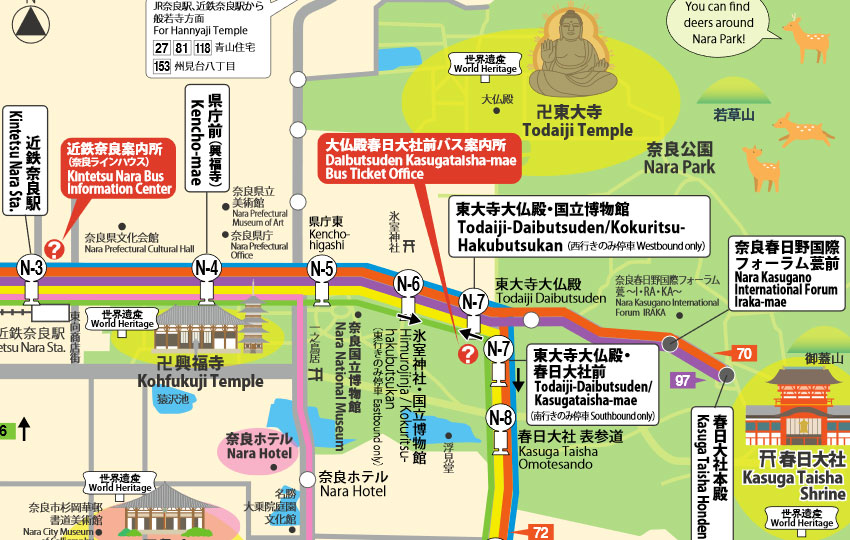 เราออกจากที่พักเดินประมาณ 400 เมตรก็ถึงป้ายรถเมล์ Kintetsu Nara (N3) ผมวาง plan จะขึ้นรถเมล์ไปลงที่ศาลเจ้าคาสุกะไทฉะ (Kasuga Taisha) ซึ่งเป็นศาลเจ้าประจำเมือง Nara กัน ที่จริงมีรถเมล์แค่ 2 สายที่ไปจอดที่ศาลเจ้าเลย คือสาย 70 และ 97 แต่ตอนนั้นผมลืมก็เลยขึ้นรถเมล์สาย 2 (หรือสาย 6, 72, 98, 160 ซึ่งเป็นรถเมล์วิ่งเป็นวงกลม) ไปลงที่ป้าย Kasugataisha-mae(N7) ทีนี้เลยต้องเดินใน Nara park อีกประมาณ 1 โล กว่าจะถึงศาลเจ้า Kasuga Taisha คราวนี้เลยพาสว. เดินใน Nara park รอบใหญ่เลย