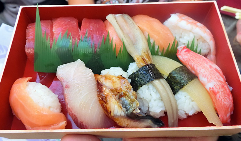| รูปที่ 10 : เจอร้านข้าวปั้นร้านเล็กๆ จานวิ่งบนสายพาน คนนั่งเต็มร้าน |