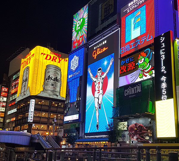 ตกเย็นเริ่มหิวแล้ว เราเดินวนกลับไปย่านดองโทโบริ ซึ่งเป็นแหล่งของกิน มื้อนี้เรากินแบบง่ายๆ คือ ใครอยากกินไรก็ซื้อมาแล้วยืนหรือนั่งแบ่งกันกินแถวหน้าร้านนั่นแหล่ะ เราเดินซื้อเก็บกินทีละนิดทีละหน่อยไปเรื่อย เริ่มจากเม็ดคล้ายๆ เกาลัดลูกโตคั่ว ทาโกยากิ ขาปูยักษ์เผา และข้าวปั้นหน้าปลาดิบ กินเสร็จก็ไปเดิน Shopping ใน Ebisubashi กันจนขารู้สึกล้า ก็เดินมาหาที่นั่งริมแม่น้ำตรงป้ายกุลิโกะ ฟ้ากำลังจะมืดแล้ว พวกเรามานั่งพักรอป้ายโฆษณาเปิดไฟ โดยหาซื้อน้ำหมักธัญญะพืช น้ำผลไม้ และขนมขบเคี้ยวจากร้านสะดวกซื้อ นั่งกินกัน