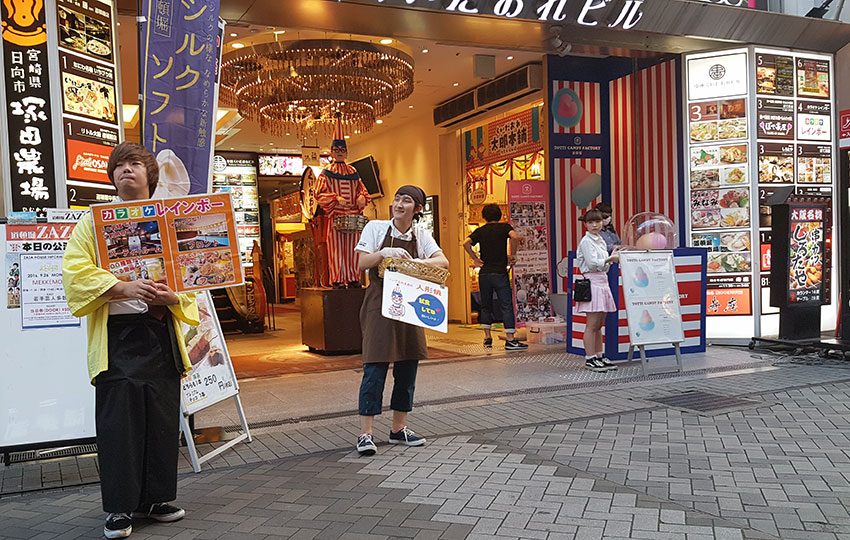 | รูปที่ 7 : คนเรียกแขกเข้าร้านที่อยู่ชั้นบนๆ ของตึก ในย่านดองโทโบริ |