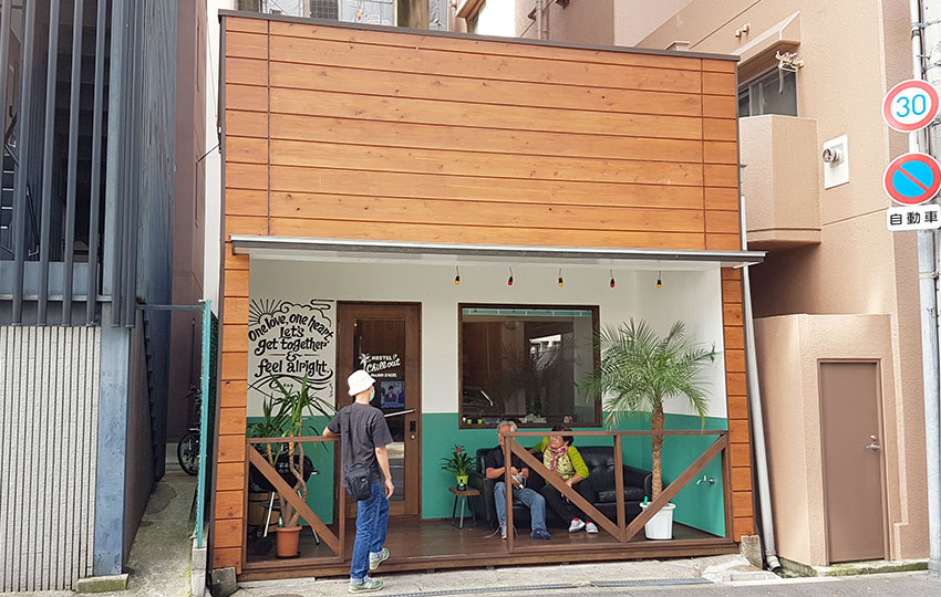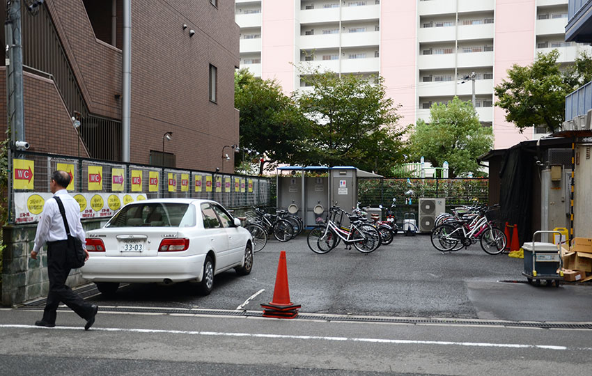 | รูปที่ 2 : พื้นที่จอดจักรยานขนาดไม่ใหญ่ ยังมีห้องน้ำแบบเรียบง่าย ใจกลางเมืองโอซะกะ |