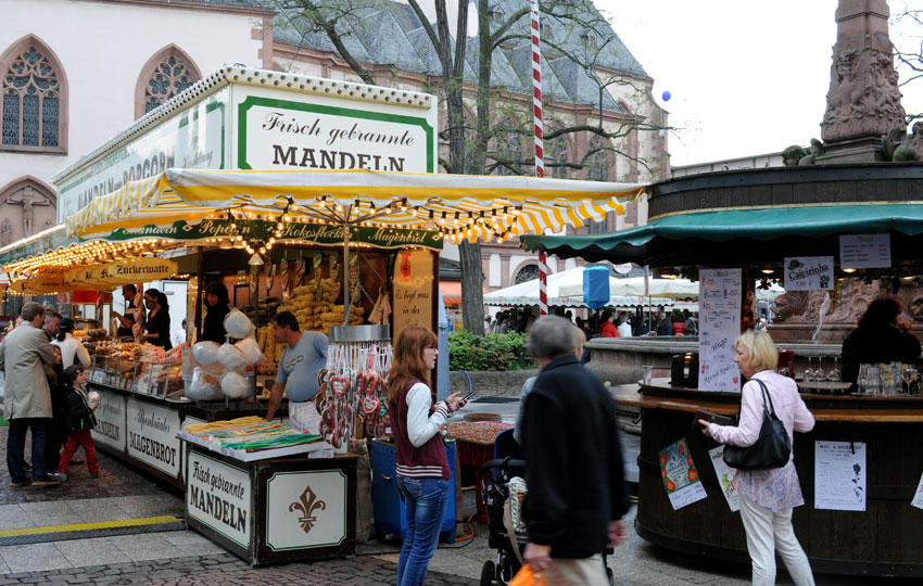พอดีบริเวณ Frankfurt Römer มีตลาดนัดเล็กๆ ให้เราเดินเล่นแล้วจึงเดินต่อไปยังถนนซิล (Zeil) ซึ่งเป็นถนนคนเดินของเมือง (Shopping street) ระหว่างทางเจอร้านขายเพลสเซลว์ (Pretzel) จึงแวะซื้อกินให้รู้แทนใส้กรอก Frankfurter ขนมปัง Pretzel บ้านเรามีขนาดเท่านิ้วก้อย แต่ที่โน่นใหญ่กว่าหัวนิ้วโปงเท้าซะอีก ชิ้นนึงกินเป็นอาหารรองท้องได้สบาย เดินมาเรื่อยๆ ไม่นานก็ถึงถนน Zeil ซึ่งเต็มไปด้วยผู้คน อาจเป็นเพราะตรงกับวันเสาร์ด้วย จึงดูคนหนาแน่น พวกเราเดินดูบรรยากาศ ฟังคนเล่นดนตรีเพื่อหารายได้ ขาย CD เพลงที่พวกเข้าทำเอง ขายเอง จากนั้นจึงเดินกลับไปที่รถ ระหว่างทางเจอร้านอาหารไทย อยู่ใกล้ๆ กันถนน Zeil ขายพวกอาหารจานเดียว มีคนนั่งที่โต๊ะตั้งอยู่หน้าร้านประมาณ 30-40 คน เราเข้าไปดูเมนูอาหาร ประมาณว่า ข้าวราดกระเพราหมูจานละ 300-400 บาททีเดียว อาหารไทยยังคงเป็นที่นิยมในแฟรงเฟิร์ต เหมือนเดิม เมนูหลักๆ เช่น ผัดเผ็ดเป็ดย่าง ไก่ผัดเม็ดมะม่วง ต้มยำกุ้ง เป็นต้น พวกเราเพิ่งมาถึงวันแรกยังไม่มีใครคิดถึงอาหารไทยเลยครับ เพราะว่ามื้อเย็นวันนี้เรากำลังจะไปจัดเต็มขาหมูเยอรมันกัน